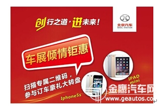 一年一度的2015湖南车展热力来袭,北京汽车针对2015湖南车展“购车钜惠 “关注公众号就有机会获取500元购车基金。最高的优惠,最惊喜的好礼都在这里,想要购车的你,绝对不需要再犹豫!  惊喜钜惠: X65 :2.0T 涡轮增压 9.88万元起 震撼上市 D70 :2.3T 豪华版 现金直降 6万元 再送iPadmini BJ40:2.4 5MT-酷野版 现金直降17000元(车展仅限三台) D20 :冰点价49800元起 D50 :1.5CVT自动标准版 最高综合优惠2万元,钜惠价59800元起