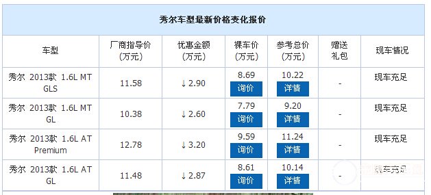 近日,本店内秀尔现车销售,颜色可选,目前购车部分车型可优惠3.19万元,感兴趣的朋友可以到店咨询购买,详情见下表: