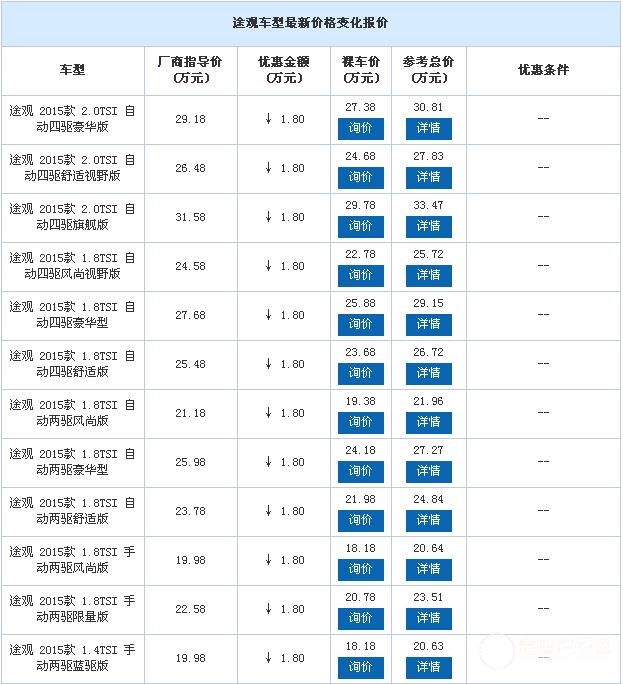申湘上海大众星沙众兴店内途观少量现车销售,颜色可选,目前购车可优惠1.8万元,送装饰礼包。感兴趣的朋友可以到店咨询购买,详情见下表: