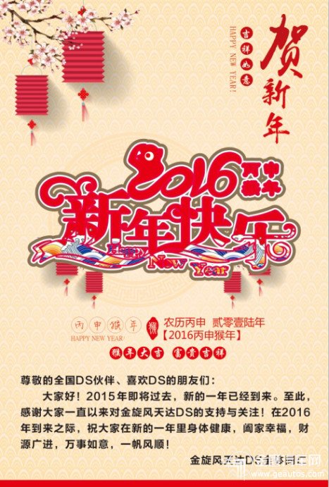 这一年,是感恩的2015、精彩的2015、辛勤的2015、硕果累累的2015,有激动也有欢笑,这一切都是属于金旋风天达DS所有车主及家人、伙伴们的2015,带着微笑,带着回忆的2015已经远去了。 对于已经到来的2016,希望我们DS这个大家族有个好的开始,我们共同进步、共同发展,向着美好的明天前进,也希望广大车主朋友们继续支持我们。金旋风天达DS全体工作人员必将全力以赴、奋战到底!