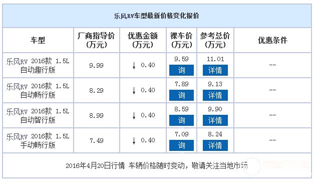 近日,本店内乐风RV现车销售,颜色可选,目前购车部分车型可优惠0.40万元,感兴趣的朋友可以到店咨询购买,详情见下表: