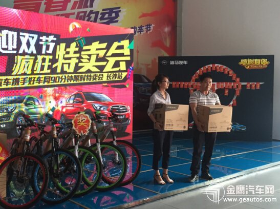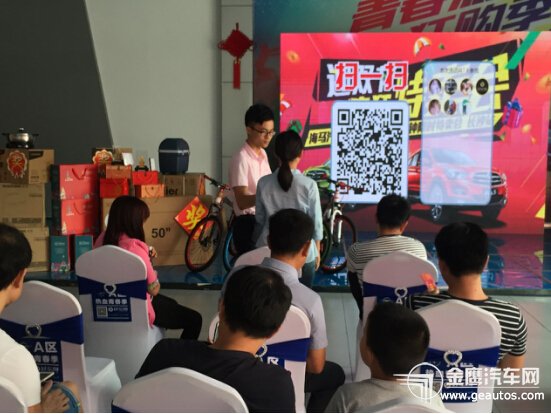 海马汽车“迎双节 疯狂特卖会”特卖活动就在今天下午火热进行中,在长沙捷程锋锐海马店早已准备就绪啦,看看这气势磅礴的场面,还有美美的各种美食佳肴,台上那满满的奖品更是令人心动不已啊,海马标志墙上的各种红包等待你们领回家!手快有,手慢无哦!
