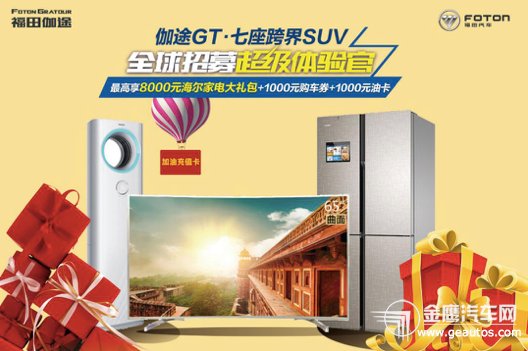 【激情参与有奖问答活动】 超级体验 赢取万元超级豪礼 伽途GT上市同时启动超级体验官招募活动,首期招募200名用户参与福田伽途GT产品体验活动,通过官网报名参与即可获得1000元购车优惠,预约试驾体验还有机会抽取最高500元油卡试驾礼,活动期间购车更有价值8000元海尔家电大礼包,完成超级体验官任务赢取最高500元油卡任务奖励。 福田伽途GT从“智美于行,悦动于心”的设计理念出发,创新性的在操控、外观、安全性及动力等方面做出突破,致力于打造一款操控智能化、动感炫外观、驾享高安全、强劲新动力的SUV,完美的诠释“智·美·悦·动”的产品内涵。