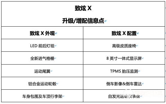 “型”出格,打造硬朗动感“SUV Like” 致炫X在外观造型方面迎合年轻群体喜好进行大胆革新,全面提升“硬朗型动感”。 整车尺寸相比致炫在宽度及高度上有近20mm的提升,同时整车外观偏向SUV化,通过宽体化设计以及新增的车身包围降低视觉重心,刻画出一种硬朗动感的SUV风格。全新设计的前脸以家族式KEEN LOOK犀利眼神和大嘴进气格栅为基础,将原先的网格状样式改换成横条式设计,使前脸造型更加大气并富有冲击力。