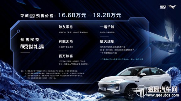 创新科技力量,破壁机械智能与生命体的隔阂,全球首款“仿生智驾生命体”鲸耀东方!2022年3月17日,上汽荣威旗下全新智能SUV车型“鲸”通过首个AR元宇宙形式开启线上预售发布,荣威品牌营销部市场总监赵梦杰化身元宇宙智能探索家,带线上观众一睹荣威元宇宙的“鲸”彩科技,宣布鲸正式开启预售,预售指导价16.68万至19.28万元,即刻下订,可享36期0息等专属“鲸”喜。  新车型鲸以源于深海巨鲸仿生造型设计的“鲸之美”、全新一代2.0TGI蓝芯发动机与爱信8AT变速箱构成的“鲸之力”,司南智驾系统、洛神智能座舱等科技赋能的“鲸之智”,为敢于探索、有独特品味和审美的智能科技追寻者提供震“鲸”之选,拉开上汽荣威品牌进一步年轻化、个性化的序幕。作为燃油车中的全新智能新标杆,鲸将与“鲸世代”共同迈入荣威元宇宙,预定年度“鲸”品。  潮颜巨肺高智商,这鲸相当“能打” 鲸是海洋中体型最大的哺乳动物,也是智商最高的海洋生物,是地球上“独一档”的存在。作为上汽荣威全新系列首款产品,鲸拥有极具辨识度的仿生设计、提升驾驭感的黄金动力与充满生命力的智驾科技,全方位演绎鲸之美、鲸之力和鲸之智。  从深海巨鲸上汲取设计灵感,鲸以仿生造型加持潮颜外观,以跨界思维营造轻奢美感,诠释壮阔不可方物的“鲸之美”。流线美·鲸式设计,动感溜背迷倒众生;鲸纹·呼吸格栅,30道棱条呈扇形排列,凸显视觉冲击力;能量·海底之眼LED大灯、扰流·灵动尾鳍、鲸灵·鲸鳍后视镜,无不打破传统设计理念,演绎智慧生命体设计,尽显生于时代而先于时代的“鲸世美学”,颜值独一档。    基于最新一代蓝芯发动机与爱信8AT变速箱这对“黄金组合”,鲸具备超乎想象的驾驭体验,能输出骁勇气吞山河的“鲸之力”。海洋之力·2.0T涡轮增压发动机提供源源不绝澎湃动能之余,峰值扭矩更高达370N·m,释放“鲸世潜能”。加速阀·爱信8AT变速箱逻辑清晰、响应快速、换挡平顺丝滑,如鲸在海中自由切换航速般酣畅淋漓,性能独一档。   作为“仿生智驾生命体”,鲸搭载全新司南智驾系统,基于顶格硬件和超强算法,带来悠然乘风破浪的“鲸之智”。从底层算法、高精定位等多方面全栈开发,融合视觉与雷达双重感知力,将一键停·视觉融合自动泊车、分身术·NGP智驾领航系统等功能落地,逐步实现全场景安全智驾体验。旗舰芯·高通骁龙8155芯片、智慧助手·洛神智能座舱系统、环幕巨屏·双12.3英寸IMAX高清屏有机结合,以“鲸世超脑”让灵感自由驰骋,智慧独一档。   零息保值终身管,“养鲸”毫无压力 此次鲸预售发布会采用别出心裁的AR元宇宙形式,以一段震撼人心的“鲸耀东方”AR视频霸气开场,用高科技手段构建起科技感爆棚的“荣威元宇宙”,将“鲸”具象为力量的象征、智慧的符号,更是美的代名词。   从基础配置到进阶配置,鲸以3种知名鲸类命名,按体格从小到大分为三档:萌态可掬的白鲸,代表仿生智慧的体验启蒙,售价16.68万元;高度社会化的虎鲸,象征仿生智慧的思考领悟,售价17.58万元;最大的鲸类、也是现存最大的动物蓝鲸,寓意仿生智慧的崭新创造,售价19.28万元。荣威还为参与预售下订的用户,提供了“鲸友零息”36期0息(至高13000元金融贴息),同时可享受2年78折保值回购,以及终身原厂整车质保、司南高阶智驾系统终身免费升级、百万APP积分一系列专属“鲸”喜,助你“养鲸”无压力。可选深潜黑、风暴灰、浪极白、镜澈蓝、浪礁灰5款源自五大洋的创意车色,满足与众不同的你。