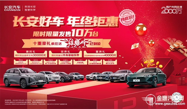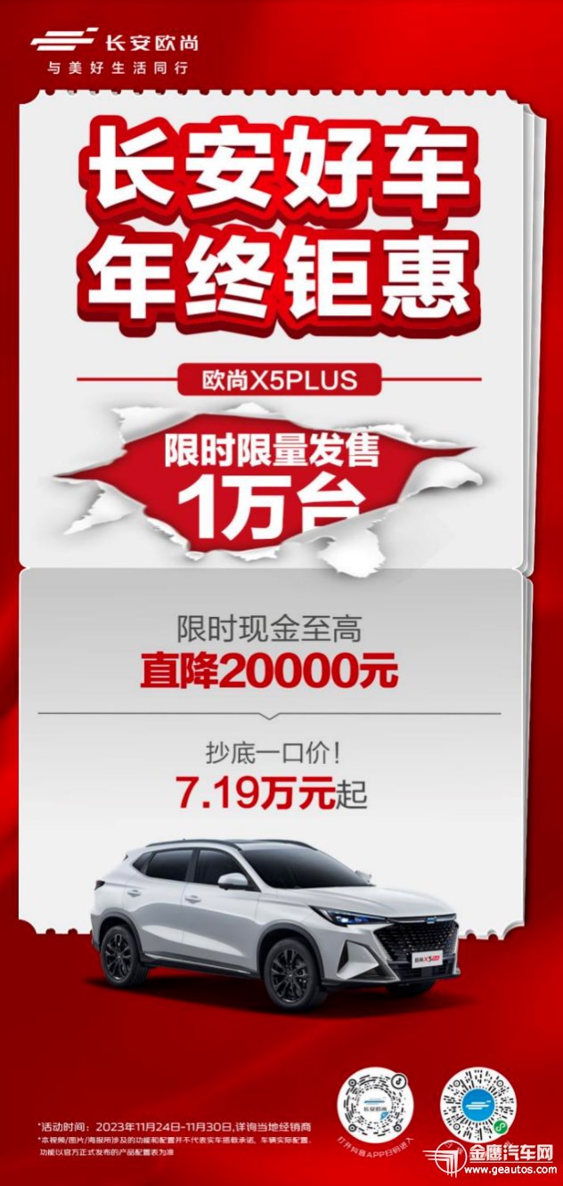 与此同时,购买长安欧尚Z6车型,抄底一口价,惊喜不断惠不停,限时限量发售1万台。 科技繁荣时代,当选“SUV智能天花板”!长安欧尚Z6智电iDD和长安欧尚Z6,都搭载了OnStyle 5.1智慧快乐座舱,以“一大首发和四大领先”智能化配置,共同打造未来快乐出行体验。驾控品质上,“12万级新能源SUV实力担当”长安欧尚Z6智电iDD拥有同级最大电池包,纯电续航里程150KM、满油满电综合续航1200KM,驾控体验领跑同级;连续5个月销量破万的长安欧尚Z6,搭载蓝鲸新一代NE 1.5T发动机+7DCT湿式双离合变速箱、蓝鲸新一代NE 2.0T发动机+爱信8速手自一体变速器两套动力组成,助力用户尽享澎湃驾感。 “年轻人的第一台智趣SUV”,选长安欧尚X5 PLUS就GO了!  强势感恩回馈,价格一降到底。11月24日-11月30日,购买长安欧尚X5 PLUS车型,享鲸爆抄底价以及更多惊喜优惠,限时限量发售1万台。 作为“年轻人的第一台智趣SUV”,长安欧尚X5 PLUS以高价值标准为用户打磨出高质量的产品体验。该车搭载OnStyle5.1智慧快乐座舱-年轻特别版,带领年轻用户开启智趣出行生活;动力进阶,该车具备蓝鲸新一代NE 1.5T发动机+蓝鲸7速湿式双离合变速器黄金动力组合,起步、超车和后程加速上均快人一步,带来更具质价比的潮趣用车体验。 作为自主汽车品牌的第一梯队,长安汽车火力全开,誓夺自主品牌销冠王!回顾2023年,从1月-10月,长安汽车累计销量达到211万辆,同比增长10.7%。其中,集团自主品牌表现愈发强势,2023年累计销量高达174.7万辆,同比增长15.9%。 冠军品质成就高度自信,今年4月,长安汽车推出了“海纳百川”计划,该计划旨在通过5~6年时间整体推进出海战略,全面铺进海外各市场产品布局。目前,长安已累计进入全球63个市场,在海外已建成450家销售渠道。未来,长安汽车还将加快布局欧洲、美洲、中东及非洲、亚太、独联体六大区域,进入90%以上的全球市场。 与此同时,与长安汽车“海纳百川”同步推进的,还有新能源“香格里拉”和智能化“北斗天枢”,共同组成长安汽车三大战略。步步为营,稳扎稳打。今后,长安汽车还将持续提升智能智造实力,加速电动化转型步伐,促成全面领先的出行生态,力争从中国走向全球,打造世界一流汽车品牌。 「长安好车 年终钜惠」活动,正在火热进行中。如果你正好有购车打算,11月24日-11月30日,欢迎前往当地长安欧尚长沙阳光100店咨询购买,买好车选长安,开启智慧舒享的出行生活!