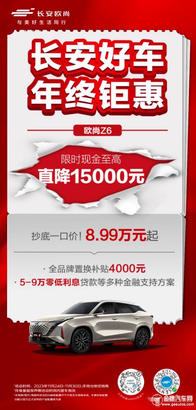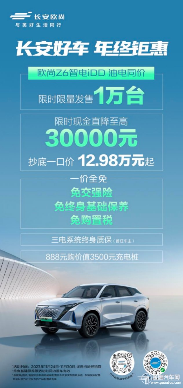 年终盛典,火力全开!长安汽车力争自主品牌销冠王,再发大招!11月24日-11月30日,长安欧尚长沙阳光100店推出「长安好车 年终钜惠」促销活动,诚意奉献广大消费者,更有王牌产品现金直降和惊喜福利大放送,钜惠享不停!  长安欧尚车系官方直降,至高优惠30000元,正是购车好时机! 据长安汽车内部消息透露,此次「长安好车 年终钜惠」促销活动,长安欧尚主流热门车系集结,以超惊喜价格直降优惠,强势拉低购车门槛。 其中,长安欧尚Z6智电iDD车系,现金至高直降30000元,现价12.98万元起(原市场指导价15.58万元起);长安欧尚Z6车系,现金至高直降15000元,现价8.99万元起(原市场指导价9.99万元起);长安欧尚X5 PLUS车系,现金至高直降20000元,现价7.19万元起(原市场指导价8.89万元起)。 遍看车市各大自主汽车品牌,长安汽车率先推出年终购车钜惠,主流热门车系现金直降,可以说是本年度给到消费者的最后一波价格福利。毫不夸张地说,这绝对是广大长安汽车粉丝的最好买车好时机! 当然,想要力争自主汽车品牌年度销冠,长安汽车带来的惊喜远远不止官方现金直降这么简单。与此同时,针对品牌主流热门车系,长安还推出了超有吸引力的金融和保养政策,给广大消费者奉送一站式钜惠购车体验。 “智能座舱天花板”,长安欧尚Z6/智电iDD定义智感出行!  11月24日-11月30日,凡购买长安欧尚Z6智电iDD车型,即可享受三电系统终身质保(首任车主)和888元购价值3500元充电桩优惠政策,限时限量发售1万台。