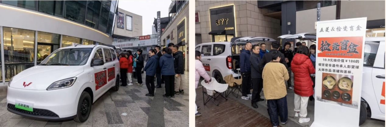 五菱&捡瓷盲盒 只需19.9元,就能把价值186元的铜官窑非遗传承人彭望球大师亲制作品——手工茶罐与茶杯带回家!”这不仅是捡漏,更是一场与千年窑火、匠人精神的超值邂逅。我们让非遗不再遥不可及,让大师手作真正走入日常。 活动现场,“捡瓷盲盒”摊位前始终蜿蜒着热情的长队,成为市集当之无愧的“人气王”。