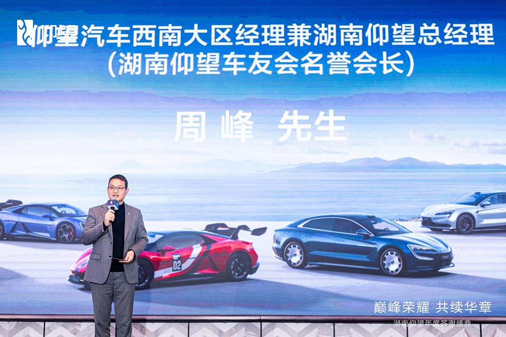 盛典的庄重时刻随着两位仰望品牌代表的登台而到来。仰望销售事业部总经理助理郑羽先生,以及仰望汽车西南大区经理兼湖南仰望总经理周峰先生先后致辞。他们回顾了品牌与车主携手同行的旅程,诚挚感谢每一位车主的信赖与支持。周峰先生动情地表示,湖南仰望车主是品牌最珍贵的家人,此次盛典更是一场专属于家人的“家宴”,并向在场嘉宾分享了仰望品牌的最新理念与未来展望。