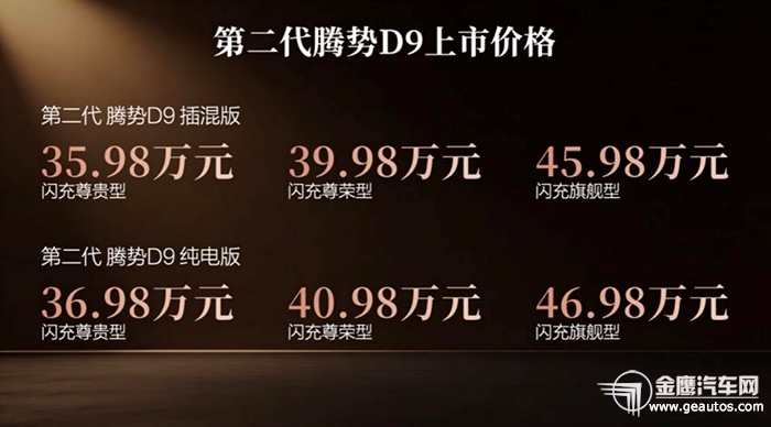 4月27日,科技豪华旗舰MPV——第二代腾势D9震撼上市,推出插混版3款、纯电版3款,共计6款车型,官方指导价35.98万元—46.98万元,全维突破体验进阶。为了满足用户对于豪华出行的极致追求,第二代腾势D9搭载比亚迪第二代刀片电池及闪充技术、全球首创「合元」超集成动力平台、天神之眼 5.0辅助驾驶系统、双阀云辇-C等前瞻科技,带来九大新迭代,在美学、空间、舒适、科技、安全等全面进阶,重塑豪华MPV价值新标杆。