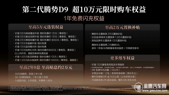 为感恩新老用户的支持和信赖,即日下订第二代腾势D9,可享至高价值超10万元限时购车权益!包含12个月免费闪充权益以及2年0息或3年低息等金融方案。此外,本次置换权益诚意十足:腾势车主可以享受2万元的置换补贴,比亚迪或者奔驰车主可以享受1.5万元的置换补贴,其他品牌车主也可以享受1万元的置换补贴。