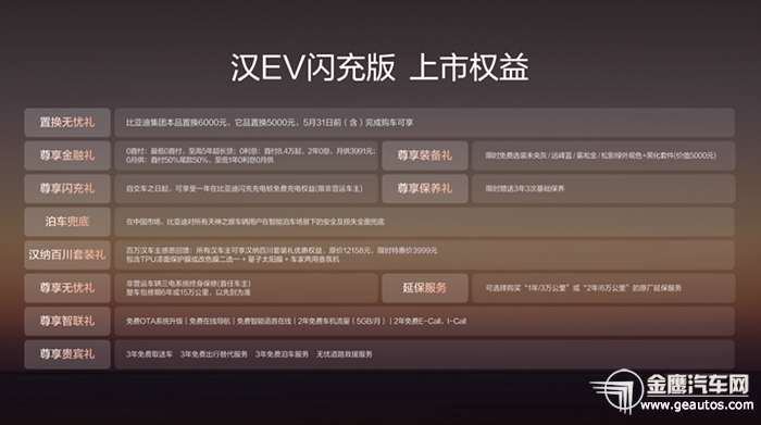 同时,比亚迪还为用户准备了置换无忧礼、1年免费闪充权益、0首付/0利息/0月供任选其一的金融礼、3年3次基础保养、包含3年免费取送车的尊享贵宾礼等共11项权益。针对追求个性的用户,官方推出价值超1.2万元的“汉纳百川”进阶生活套装,限时特惠价仅需3999元。