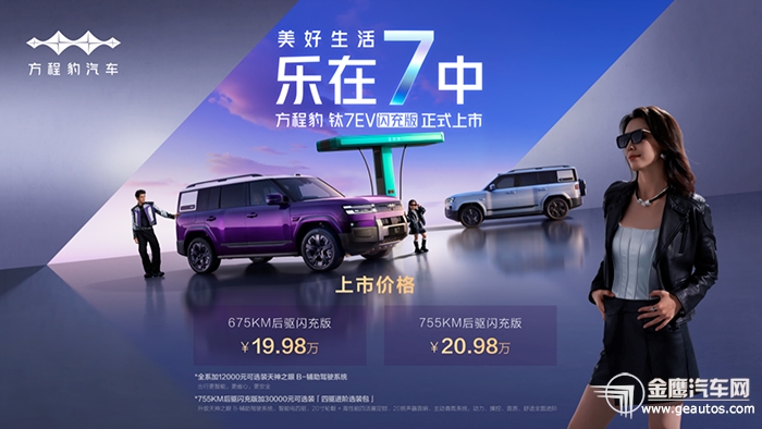 4月29日,方程豹钛7EV闪充版正式上市,推出675KM后驱闪充版、755KM后驱闪充版,售价分别为19.98万元、20.98万元。 其中,全系加12000元可选装天神之眼B-智能辅助驾驶系统,出行更智能,更省心,更安全。755KM后驱闪充版加30000元可选装「四驱进阶选装包」,升级天神之眼B-智能辅助驾驶系统、智能电四驱、20寸轮毂+高性能四活塞定钳、20 扬声器音响、主动香氛系统,动力、操控、音质、舒适全面进阶。 钛7作为比亚迪的明星产品,也是方程豹极具划时代意义的现象级爆款,连续6个月登顶混动SUV和方盒子车型的双料冠军,更是开创了单月销量突破3万台的行业奇迹,让方盒子从过去的“小众品类”成为了SUV的潮流之选。